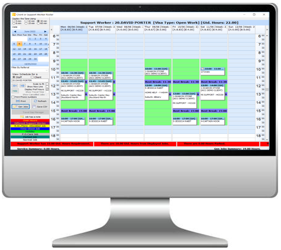 Robust Scheduling: easy to adjust and update within a clear and simple user interface, includes support worker preferred hours; support worker guaranteed hours; client needs / support worker skills; support worker / client locations